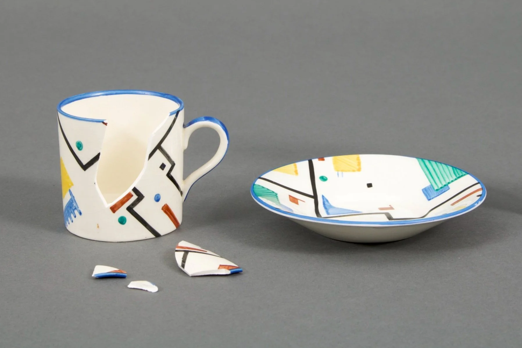 This coffee cup had a large break and three accompanying fragments. One of the cracks sprung the ceramic out of alignment. This crack exhibited two small chip losses and several additional losses.