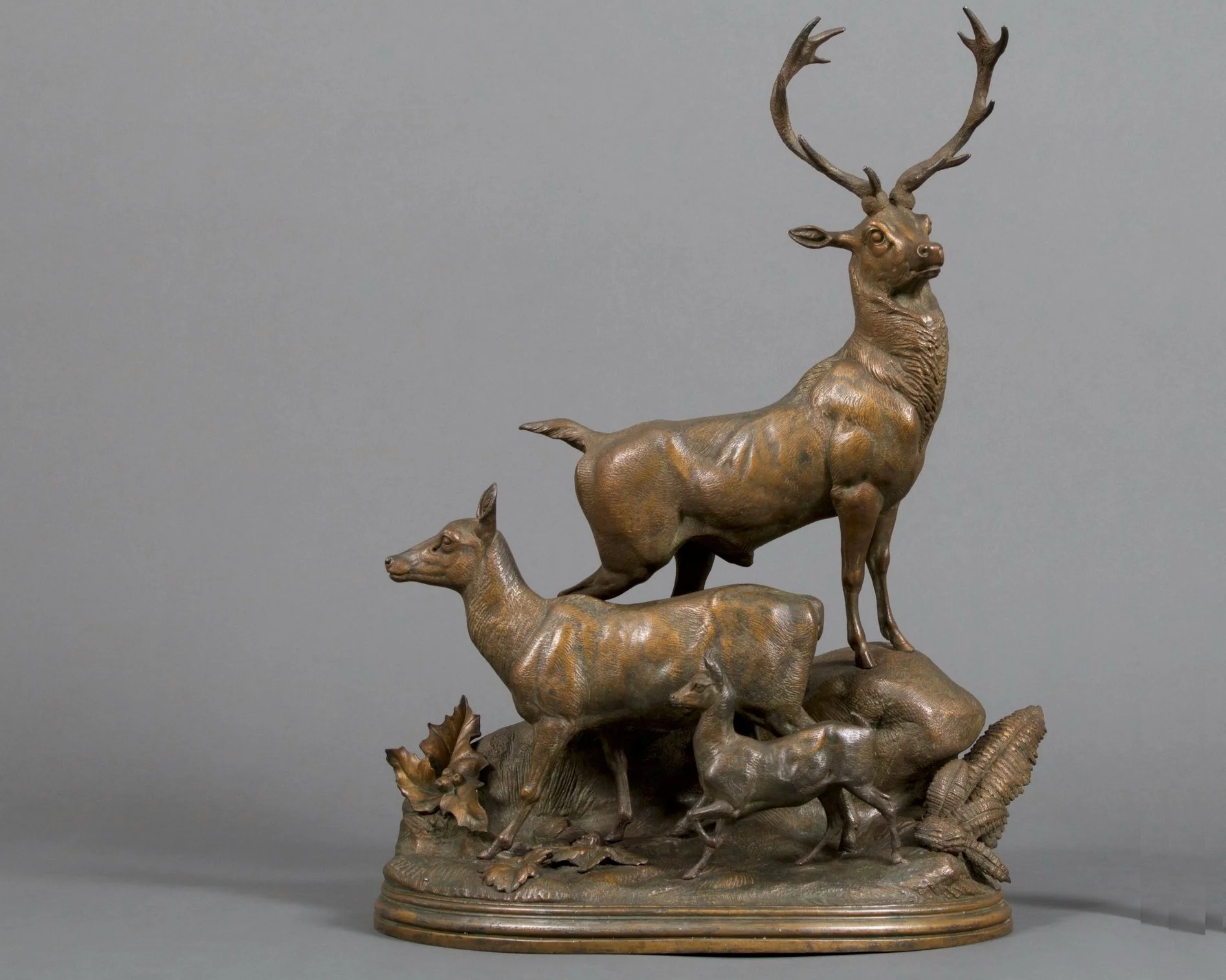 This sculpture was initially believed to be a bronze cast, due to its tone, weight and the knowledge that the artist, Hippolyte Heizler, worked primarily with bronze casts. White corrosion bursts on the underside of the sculpture, a silver-toned base metal, and handheld XRF results were consistent with the sculpture being a lead-alloy cast. Previous repair techniques were visible on the buck, doe and the fawn using epoxy, silver/gray-toned epoxy putty and solder. These techniques were distracting and in some cases failing to secure the deer. The removal of the repair materials exposed losses in the original casting.